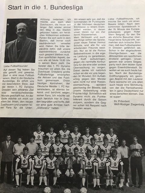 „Ich weiß. Du bist der verrückteste Fußballverrückte von ganz Dresden, aber dich haben sie – nicht die Leute, die mit dir sprechen wie ich – dich haben sie auf dem Gewissen. Du hast von 100 Menschen 80 als Feinde, und davon verstehe ich 79 nicht, warum sie deine Feinde sind. Ich weiß es nicht. Wenn du heute zum Beispiel diesen Löffler liest: ich habe nie etwas gesehen, was der Verein von dem groß gekriegt hat. Rüdiger, ich bin nach wie vor 110 Prozent überzeugt: DU hast diesem Verein nie eine Mark genommen. Das weiß ich. Jetzt ist genau das passiert, was ich mit dem Rücktritt des Schatzmeisters vereitelt habe: Du trägst jetzt allein die Verantwortung der Vergangenheit, aber diese Verträge haben ganz andere Leute unterschrieben. Nur die sind alle weg, ja, du trägst die Verantwortung allein.